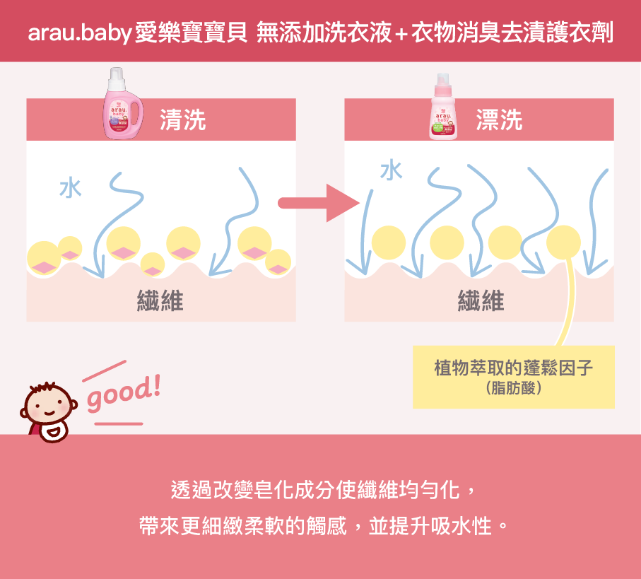 搭配arau.baby 愛樂寶寶貝 無添加洗衣液一起使用,能 讓衣物更加蓬鬆柔軟,觸感更溫和細膩。同時提升吸水 性,非常適合容易流汗的寶寶貼身衣物使用。為了呵護 新生寶寶的嬌嫩肌膚,愛樂寶寶貝堅持不添加合成柔軟 成分(合成界面活性劑)、人工香料等化學成分。