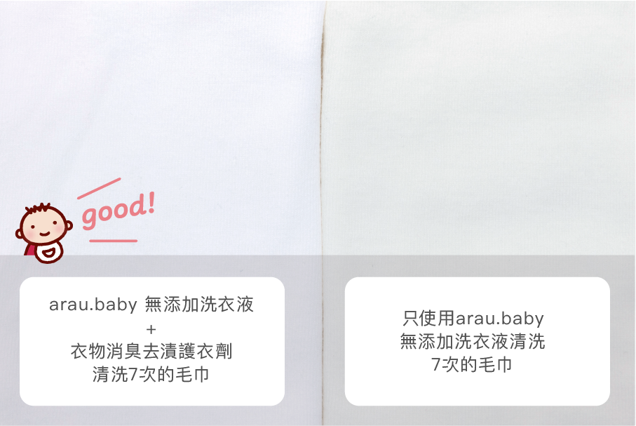 即使每天細心洗衣,纖維中仍可能殘留不易清除的皮脂 汙垢,日積月累便會導致衣物泛黃。每日搭配 arau.baby 愛樂寶寶貝無添加洗衣液使用,可有效預防 泛黃,延長衣物壽命。